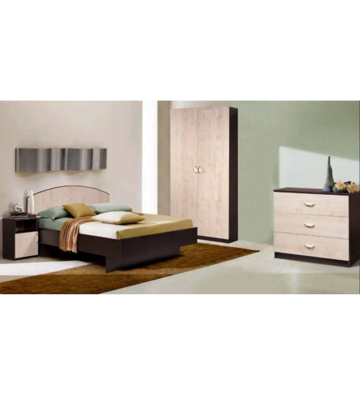 Гарнитур имеет простую конструкцию и не преобладает декоративными элементами. Набор для спальни может комплектоваться следующими предметами мебели:
